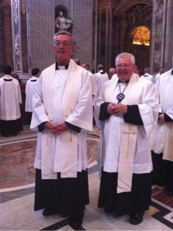 Fr. Francis was able to obtain tickets so the three of us would distribute communion during the liturgy. This requires that the priest or deacon must come in cassock. Fr. Francis scoured among his friends in Rome for cassocks that would fit the two of us. Mine came from the Mexican House of Studies. Fr. Tom and I are pictured here in St. Peter’s in full dress. The Vatican provides the stole and surplus.