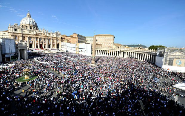 As the offertory began the priests and deacons who were to give out communion were led to an area where we picked up a ciborium and then processed in front of the altar for the Eucharistic Prayer. The pope used the Third Eucharistic Prayer as this one provides a space to mention saints names. After all present sang the Our Father the 150 priests and deacons who were to give out communion were led down the main aisle and hooked up with an usher who had a open umbrella (done in the papal colors of white and gold). The purpose of the umbrella was to make it easy for the faithful to see where communion would be given out. My first post was right down the main aisle between the altar and in front of the obelisk. When we were done in that area I moved to another spot and stayed there until I was told it was time to go. I don’t know how many were not able to receive communion but there were at least some in my area. That being said I think the Vatican does an excellent job at organizing for these large crowds.
