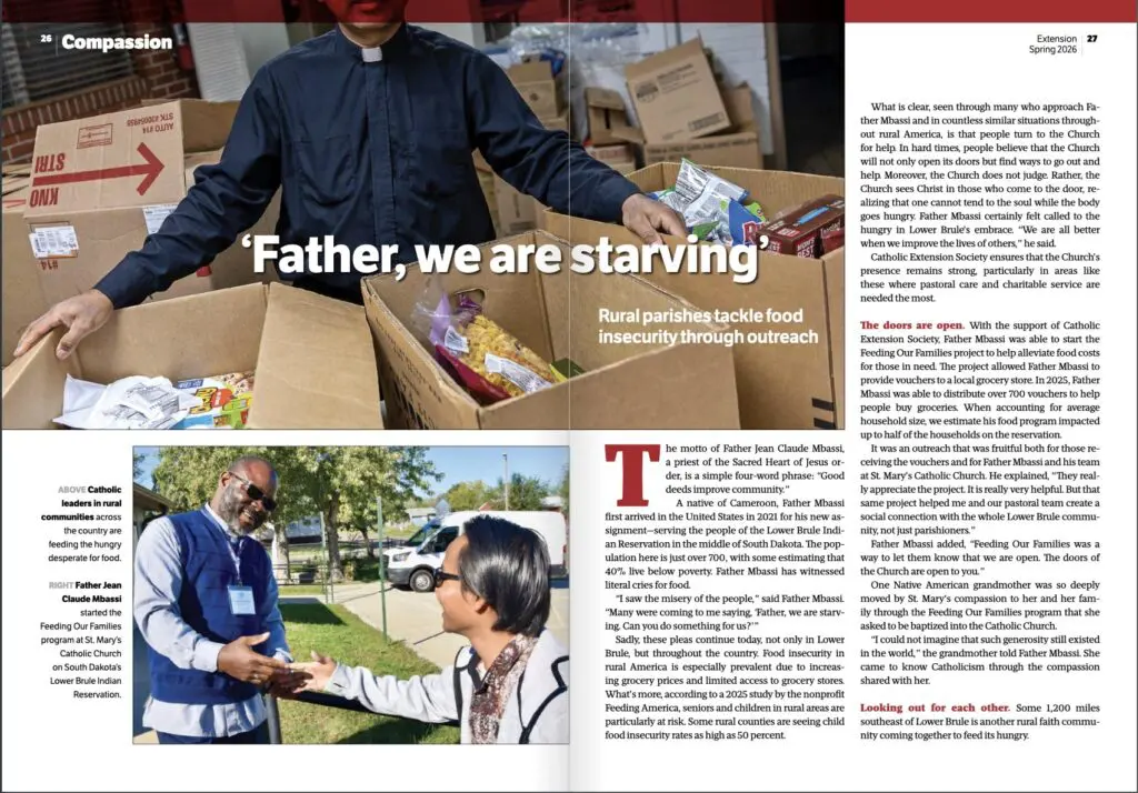 This was the quote attributed to Fr. Jean Claude Mbassi, SCJ, in the Spring issue of Extension Magazine. He, and the Dehonians’ ministry in Lower Brule, SD, were highlighted in a feature about the Extension Society’s “Feeding Our Families” project. The project allowed St. Mary’s parish in Lower Brule to distribute vouchers to a local grocery store. In 2025, Fr. Jean Claude distributed over 700 vouchers. Fr. Jean Claude is now a member of the Pinellas Park community in Florida.