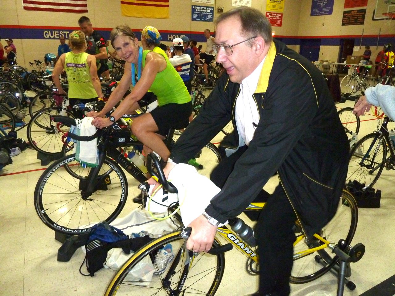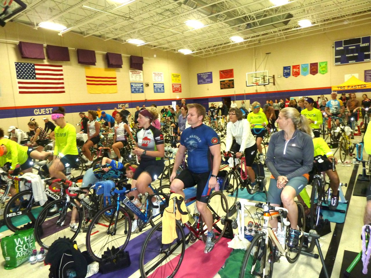 Over 100 participants filled the parish gymnasium pedaling for up to four hours on stationery bicycle trainers. Riders were treated to a variety of DJs, videos and music. Local television sports reporter Jen Lada emceed the event.