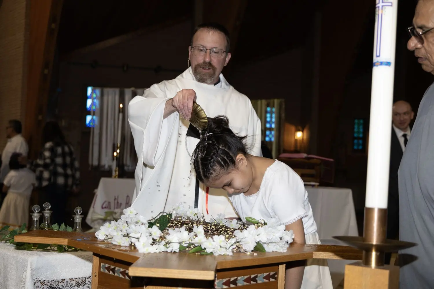 On April 12, a week after Easter, 22 students at St. Joseph’s Indian School celebrated the sacraments of First Communion, Baptism and Confirmation. Fr. Greg Schill, SCJ, is pictured above, during one of the baptisms.