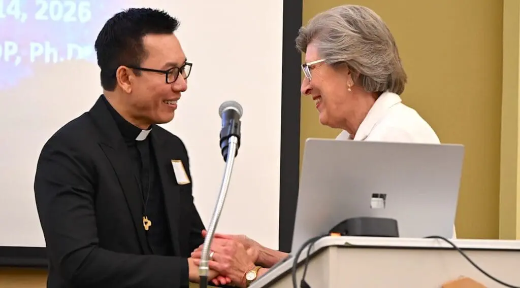 PICTURED ABOVE: Fr. Vien Nguyen, SCJ, welcomes his former professor, Sr. Barbara Reid, OP, to the gathering of religious leadership.