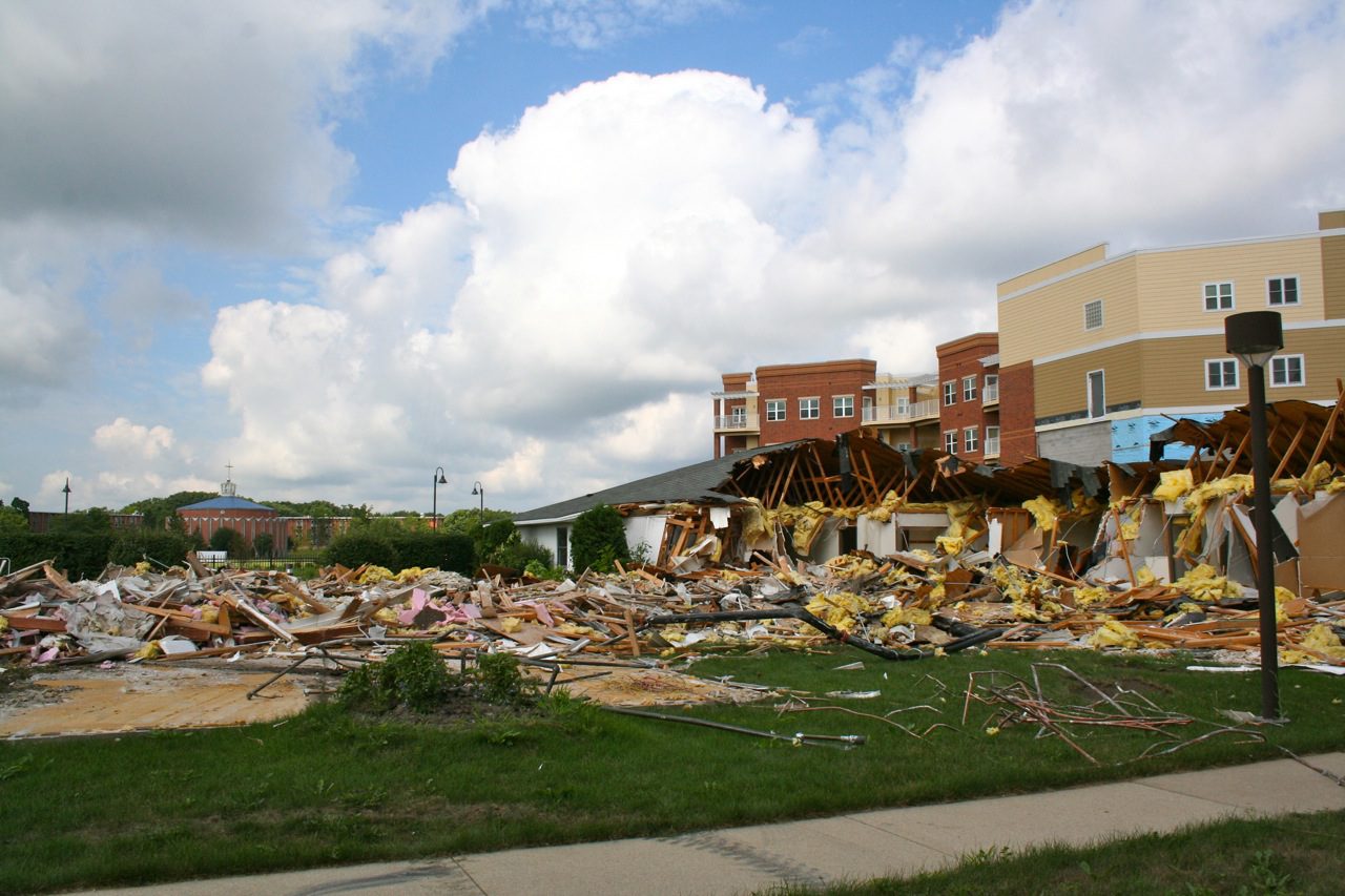 Sacred Heart Monastery, as well as the new Sacred Heart at Monastery Lake, can be seen in the background of the "deconstruction" site of Villa Mara. The building was razed last week in preparation for Phase 2 of SHML.