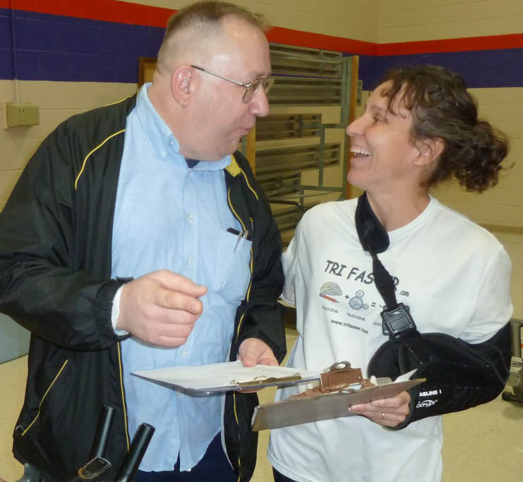 On a cold, spring day (“Perfect weather for an indoor ride,” said one participant), cyclists set their bikes on indoor stationary trainers and spent four hours riding “nowhere for a good cause,” said a volunteer. Each hour the riders were led in their efforts by a local athlete, including Olympian Brent Emery, and Lauren herself, a professional triathlete. Lauren led her session with her arm in a sling, the result of a recent surgery.