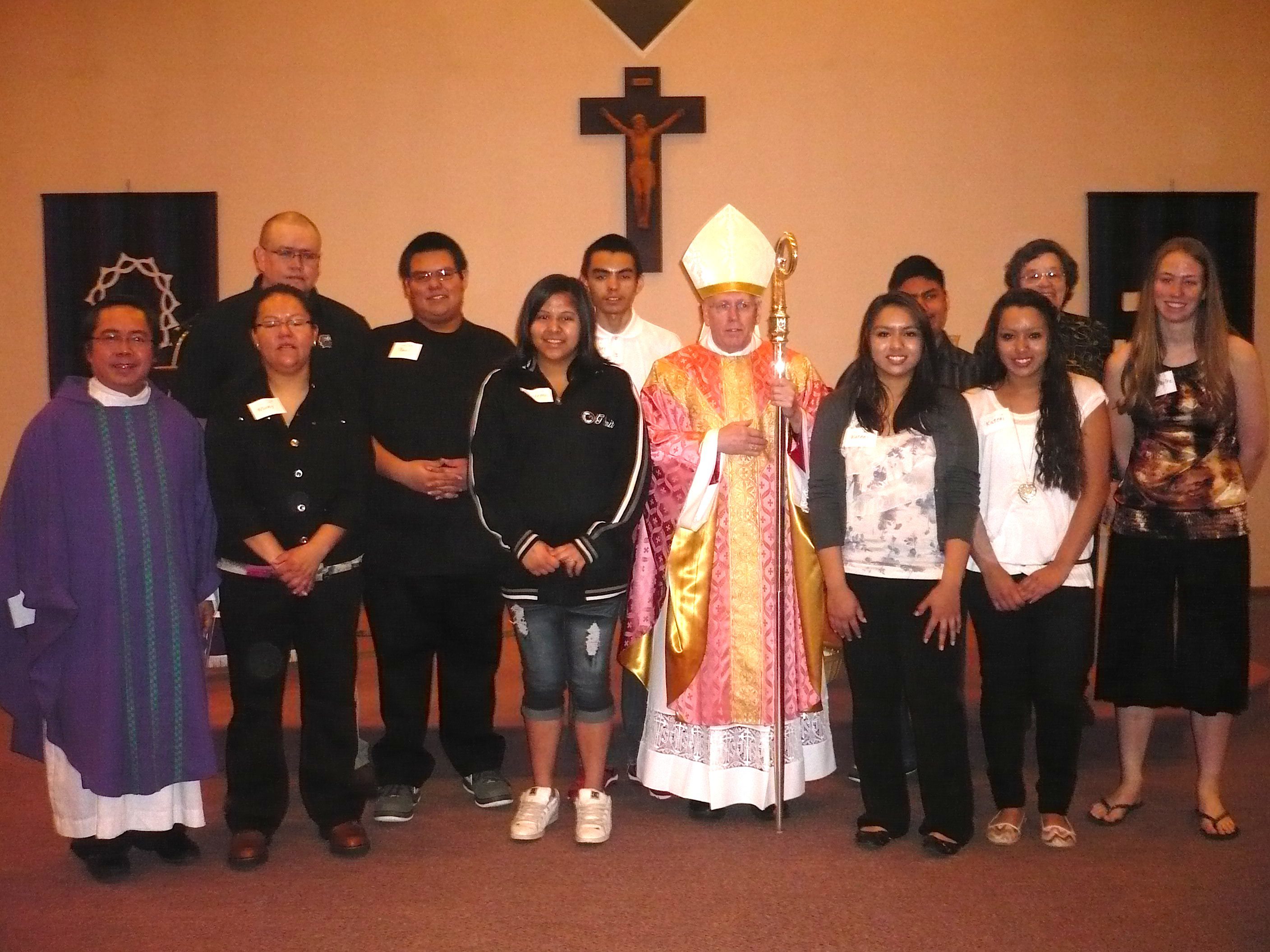 Bishop Swain with recently confirmed youth at St. Joseph parish in Fort Thompson, S.D. Pictured on the left is Fr. Vincent Suparman of the Lower Brule Pastoral Team.