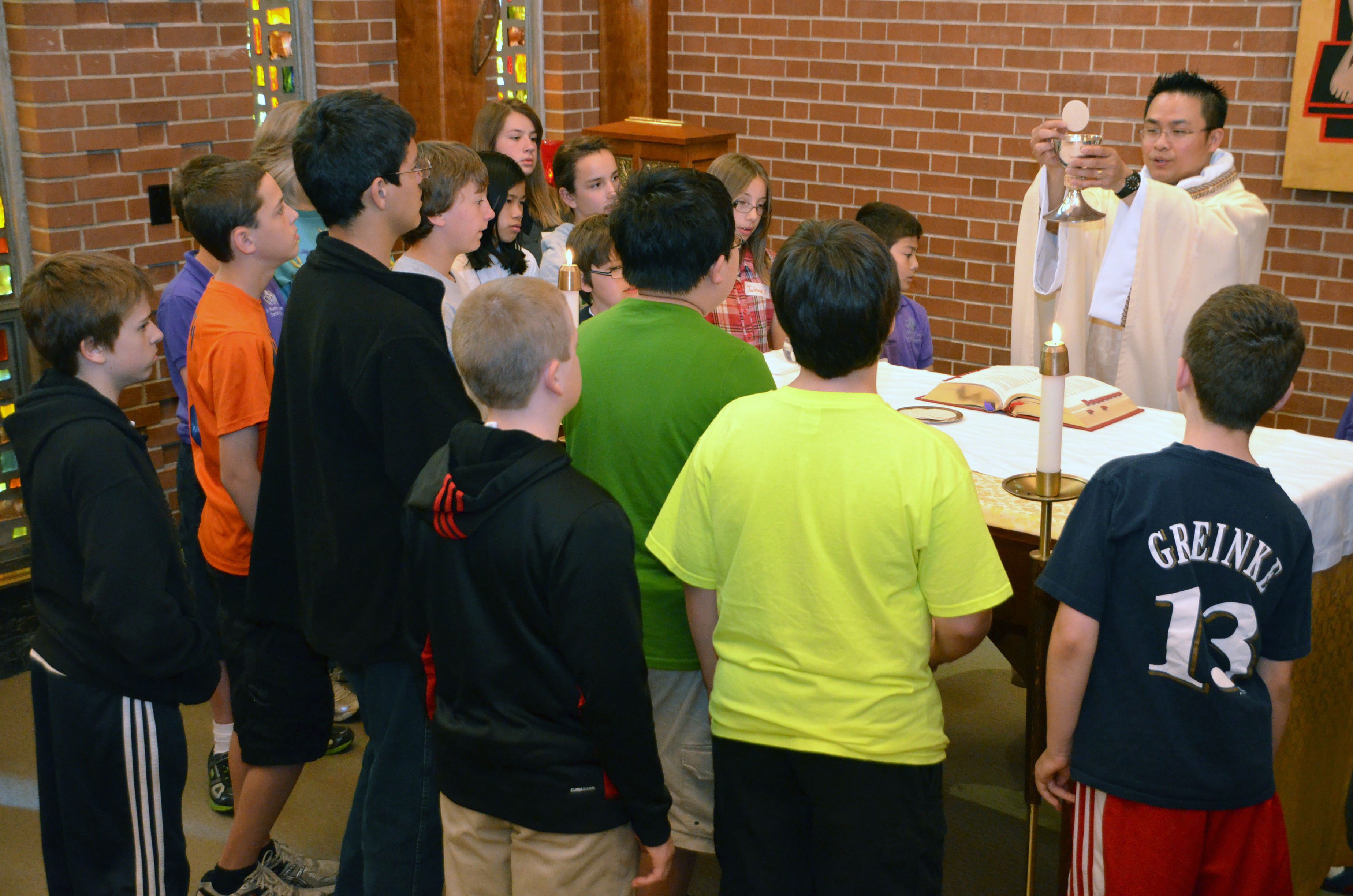 Students from St. Martin of Tours gather around the altar during Mass. Fr. Thi Pham, celebrant, led the students in their end-of-year retreat.