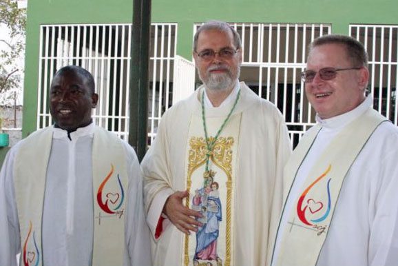 Fr. Carlos Lobo, provincial superior of Mozambique (left) and Fr. Peter Surdel, provincial superior of South Africa, with the new archbishop (center).