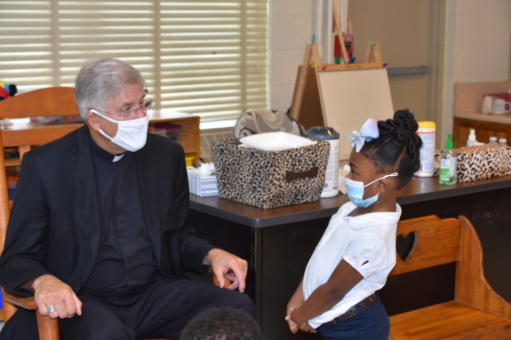 Last week Bishop Joseph Kopacz (Diocese of Jackson) celebrated a livestreamed Mass for students and teachers at Sacred Heart School in Southaven and Holy Family School in Holly Springs, MS, and then spent time visiting with students at each. Both schools are ministries of Sacred Heart Southern Missions. The bishop is pictured below with a student at Holy Family.